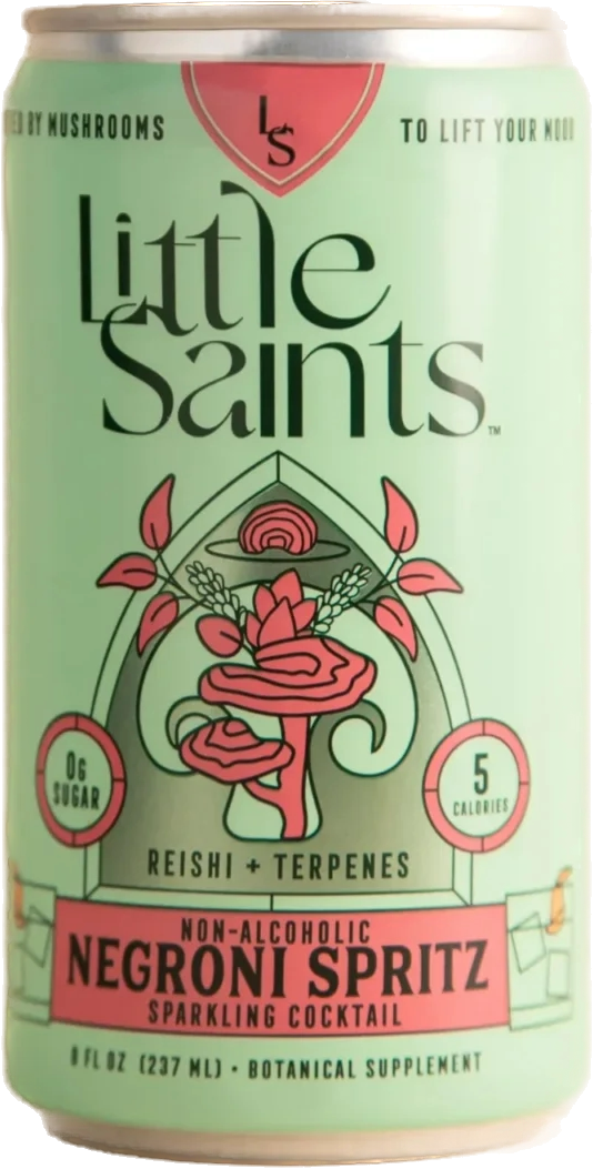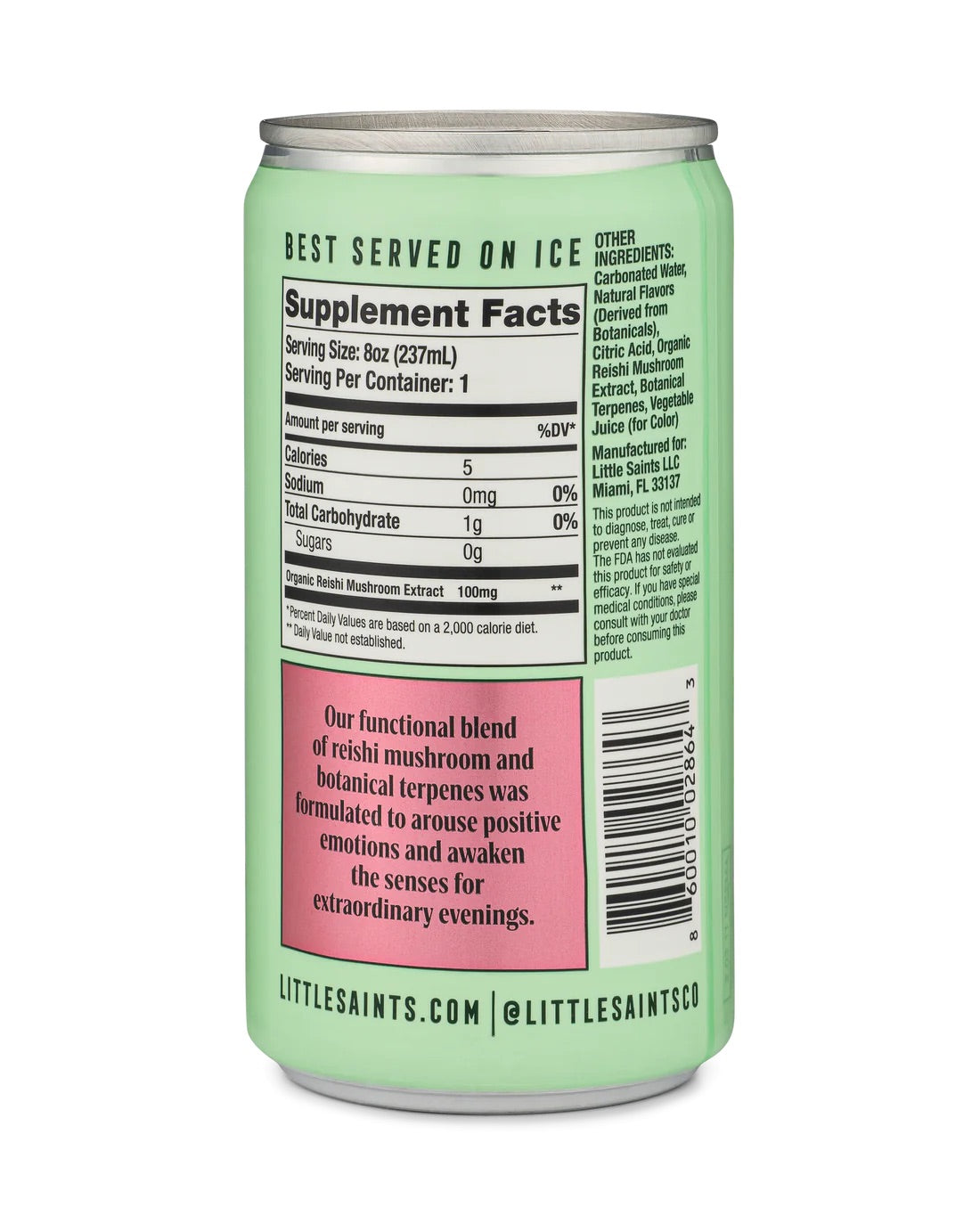 Ingredients: Carbonated Water, Natural Flavors, Monk Fruit Juice Concentrate, Botanical Terpenes, Organic Reishi Mushroom Extract, Citric Acid, Vegetable Juice (for color).